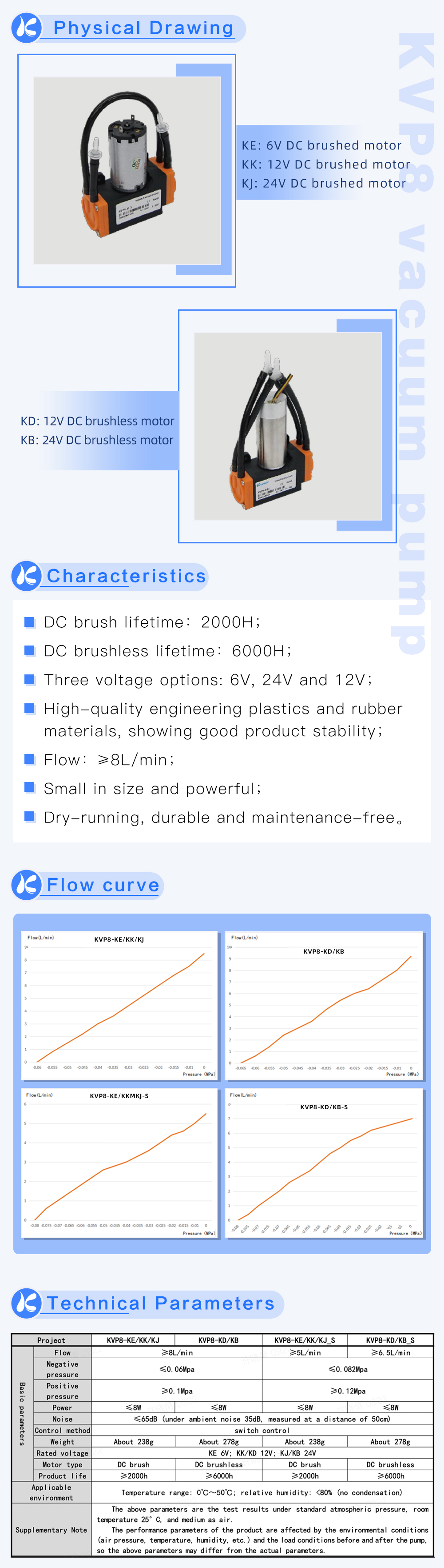 Compared to traditional gas sampling methods, the KVP8 vacuum pump has a compact design and higher efficiency, allowing for more precise gas sampling without the need for additional equipment such as large gas cylinders and pipelines, saving costs and space. In addition, the KVP8 vacuum pump has a long lifespan and high reliability, making it suitable for stable operation in harsh working environments.
