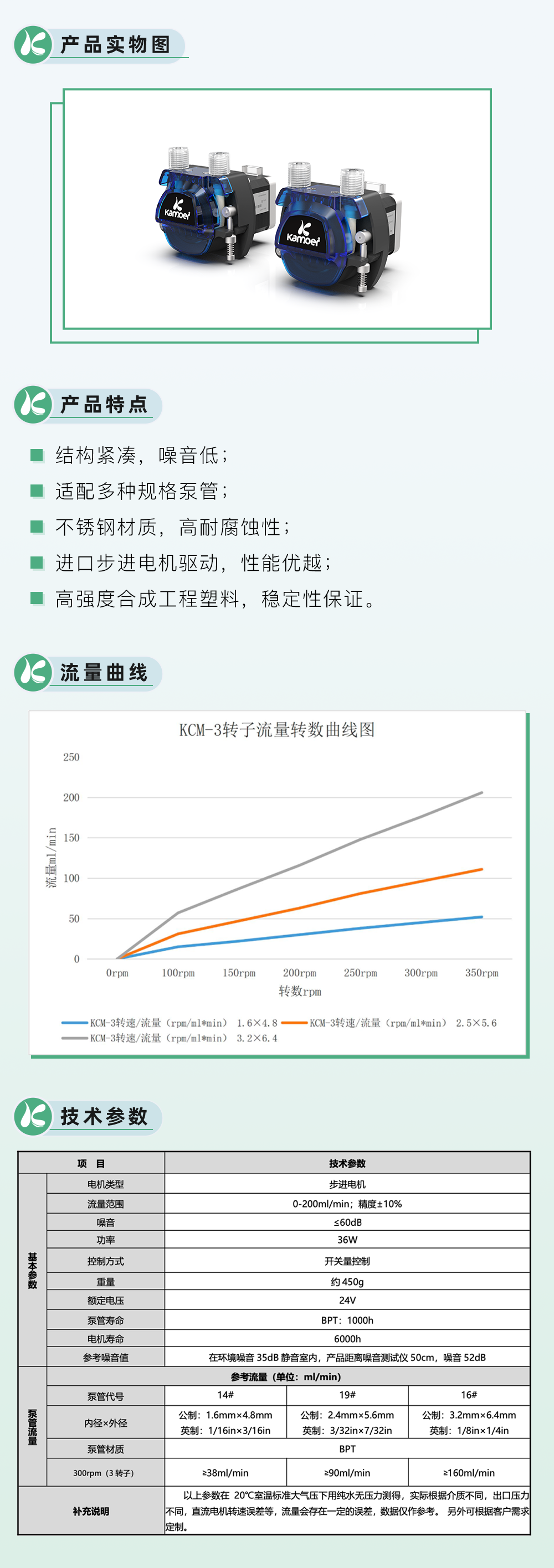 卡默尔KCM蠕动泵是一种精准的流量输送设备,能够实现流量精准控制和稳定输送。在多参数水质在线检测系统中,卡默尔KCM蠕动泵可以用来进行水样采集,即将水样从水源处采集并输送至传感器进行分析。由于流量控制精度高(±10%),能够稳定地输送水样,可以确保采集到的水样准确无误地被传感器检测到。KCM蠕动泵的泵体结构件采用高强度合成工程塑料,金属件全部采用不锈钢材质,其高耐腐蚀性可保证泵的长期稳定运转。