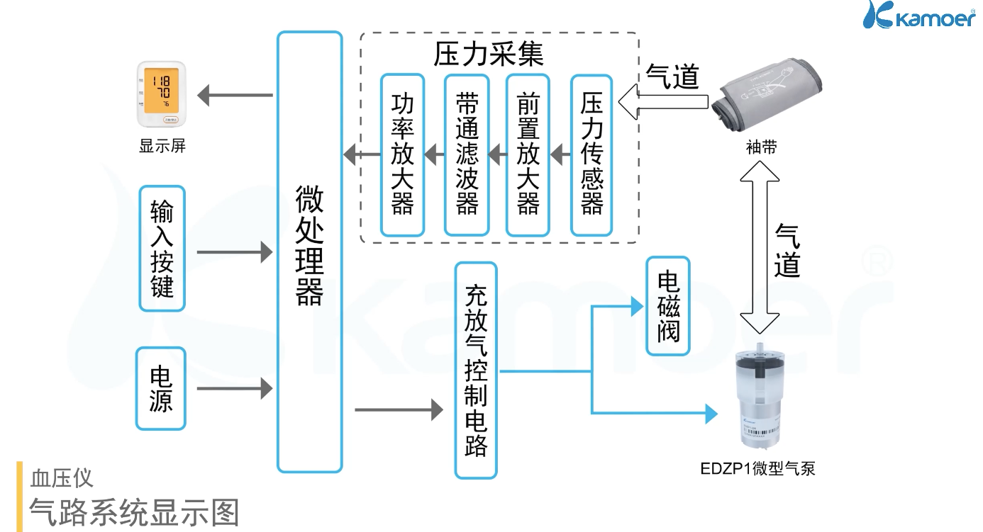 在臂式血压仪中,气泵是一个关键组件,负责为袖带充气和放气。卡默尔气泵EDZP1是一款专为血压仪设计的高性能气泵,具有以下优势: