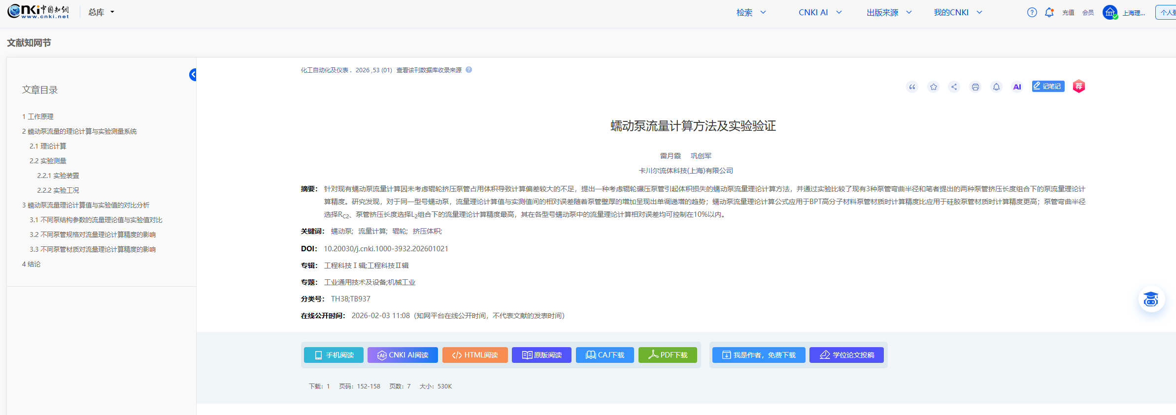 2026年1月,卡川尔流体围绕蠕动泵流量计算方法开展的技术研究成果,正式刊登于核心期刊《化工自动化及仪表》第388期。